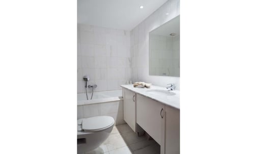 Das angrenzende Badezimmer ist Marmor gefließt mit einer Badewanne..