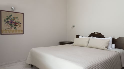 Zwei behaglich eingerichtete Schlafzimmer verfügen je über ein separates Badezimmer, mit rosafarbenem "Volos"-Marmor gefließt, das eine mit Badewanne, das andere mit Dusche