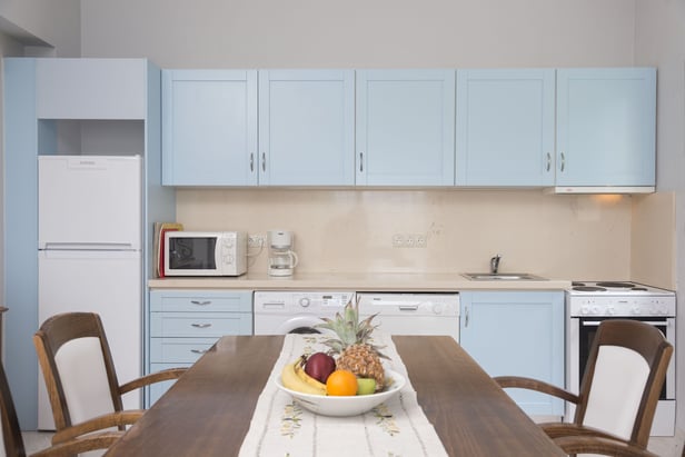 Die Küche ist funktional voll ausgestattet mit Geschirr, Besteck und den erforderlichen Elektrogeräten für den alltäglichen Bedarf.